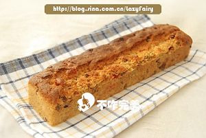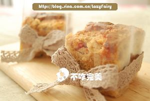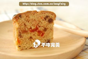 筛入低粉,混和均匀,加入腌渍好的水果干,拌匀后填入模具,蛋糕糊很厚重粘稠,果干不用再沾粉也不会沉淀,不过入模最好弄个勺子神马的辅助下。表面刮平烤箱中下层烤50分钟左右。15分-20分钟时候看一下,如果表面结了一层薄皮把蛋糕拿出来,竖着剖一刀。