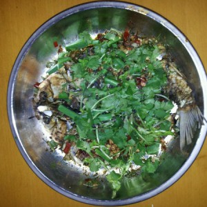先调至200度烤十五分钟!翻身再烤十分钟!最后翻回来烤五分钟后撒上剁椒和香菜即可上莱!