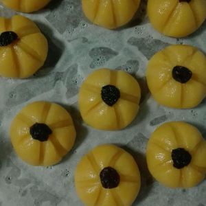 摘成乒乓球大小搓圆,用勺子把压成型,印子要稍微深一点,下锅蒸会膨胀的,上面放葡萄干点缀一下。