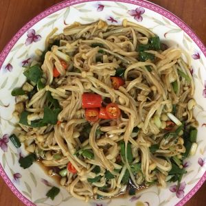 最后放酱油,陈醋,葱,香菜,蒜蓉进去搅拌,开锅放油和辣椒煮开倒进去就可以了。酱油陈醋不要放太多,因为很容易入味,和青瓜不一样。