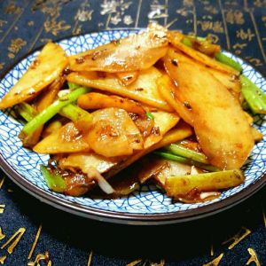 洗干净锅,重新放油放入蒜孜然爆香再倒入土豆和芹菜翻炒。