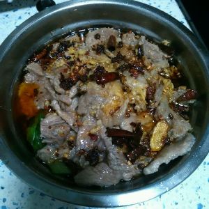在锅里放入适量的油(油要稍微多点点),把油烧到七八成,就把油淋在里脊肉片上,滋啦滋啦的声音响起, 撒上葱花, 水煮肉片就弄好了。