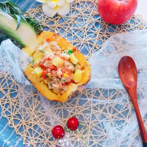 胡萝不切小丁,准备好豌豆,玉米,菠萝肉(菠萝肉要提前用盐水浸泡二十分钟,然后清水冲洗几次即可。如果你买的是甜菠萝可不必用盐水浸泡。如给小孩食用还是需盐水浸泡)