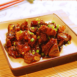 锅内留少许油,下葱姜爆香,放入炸好的小排翻炒,倒入做法(三)的调料,快迅炒制至调料完全吸附在小排上,淋入明油,起锅即成。