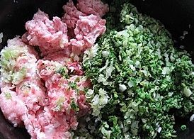 荠菜切去水分,切碎,切葱花,姜末,剁肉馅。加油盐酱油花椒面搅拌肉馅。