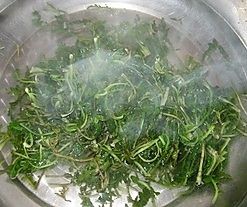 挖来的荠菜清洗干净。用开水焯一下,去掉野菜的苦味。用凉水泡上。
