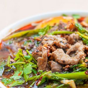 锅中留底油,放蒜泥炒香后将油淋在煮好的肉片上,撒上香菜即可。
