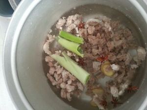 接着锅里重新放入干净的水,放入牛肉,葱,姜片,八角,盖上锅盖,大火煮开锅,改小火顿