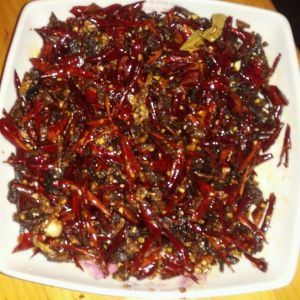 小米辣(以自己能吃辣的程度),剪成细条。相对要多,一般和牛肉的量一致,陈皮也切条。