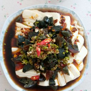 在豆腐上加入切成丁的皮蛋,倒入调好的料汁,加入辣椒油,用小勺食用。