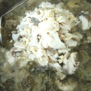 把煮熟的鱼片,放进酸菜汤里,在面上加上需要的调料。