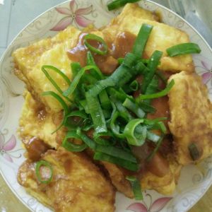 用炒锅,里面放食用油,生抽,耗油,盐,鸡精,香油,倒入适量的水(能没过煎好的豆腐就行),放入豆腐,用汤煨几分钟,汁差不多,豆腐出锅
