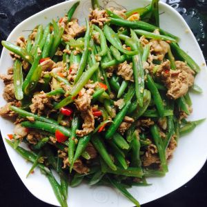 锅内烧热油,放入切末的大蒜爆香,放入沥干水分的四季豆,翻炒几下之后放入腌好的肉片,翻炒至肉片断生,放入适量的剁辣椒,盐,翻炒均匀,出锅装盘!就完成了...