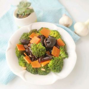 西蓝花切块 切根部掰开,不要切花那里,胡萝卜切片,木耳泡发洗干净,独蒜一个