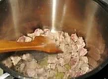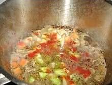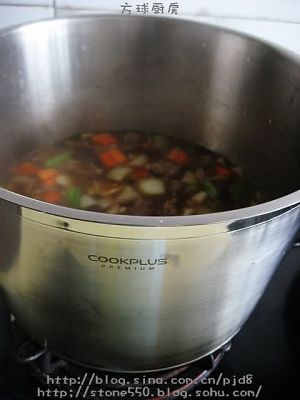 锅里加一小块黄油,把羊肉加进去炒到变色,加点黑胡椒粉,加水,水要一次加足,多点没关系,这个汤要炖久一点才好喝。