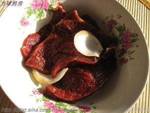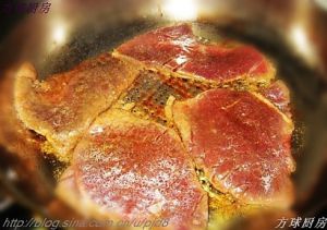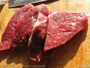 牛肉切成 6毫米左右的大片,注意千万别顺着肉的纹理切,要把周围的白色筋膜切掉,肉中间的白色的筋要多划几刀,要不煎的时候肉会卷缩变形。肉表面可以用松肉锤松,没有用刀背拍或者用牙签扎眼都可以,我什么也没有,就用刀在肉上横七竖八地划了几刀