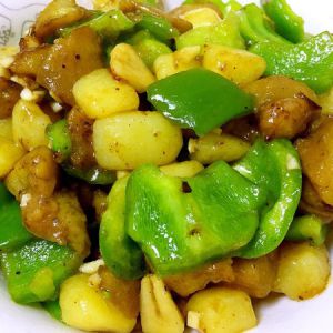 加入青椒,翻炒。加锅盖炖一会,将料汁炖没,成粘稠状。