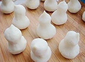 面团分成若干小面团,揉圆,捏成片,包入豆沙馅,捏成葫芦的形状