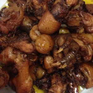 锅内放油烧热,放入调料,有香味时倒入鸡块。