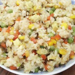 加入鸡蛋、豌豆、玉米粒、虾仁、胡萝卜丁后翻炒