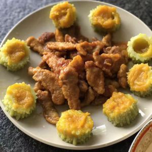 南瓜苦瓜酿:南瓜蒸熟,苦瓜切两截,用筷子挖出瓤放开水中加盐汆2分钟左右放冷水中浸泡沥干。南瓜蒸软后用勺子搅成泥灌入苦瓜中切成大块。原汁原味,要整块咀嚼方有苦中带甘、甘中有苦的竟境与糖醋里脊搭配甚好