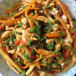 倒入肉丝和之前过水的蔬菜 翻炒一两分钟