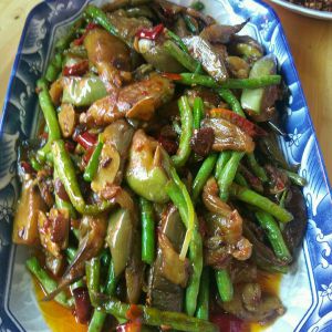 锅上油…多一点,等油温控好了以后,大火下豆角和茄条下去炸到8成熟,一定要快,这样茄子皮的颜色会保持到最新鲜的程度,我们在下一步的时候就可以只放一点油就好,因为豆角跟茄子炸好了就不吃油了。炸好的茄子豆角捞起来…锅烧一点点油放郫县豆瓣酱和我们刚才配好的姜蒜末,干辣椒,葱节子,炒香后放茄子豆角烧,调味:盐,味精,鸡精,一点酱油。起锅装盘即可…
