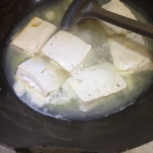 取出豆腐,这里建议大家选用石磨豆腐,或是老豆腐,要不后期改刀不方便还容易碎