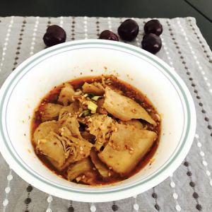 将五花肉切成薄片,加入调味料:生抽2汤匙,醋1汤匙,白糖半汤匙,芝麻油1汤匙,花椒油半汤匙,红油2汤匙