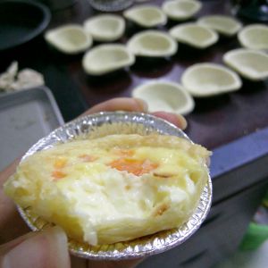 将蛋液倒入蛋挞皮内,放点木瓜粒(可根据自己的喜好放些水果颗粒)