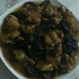炒约二三分钟,加生抽、料酒、冰糖炒匀,再倒入香菇及泡香菇的水,盖上焖煮约二十分钟