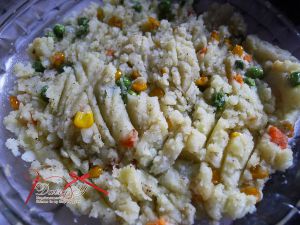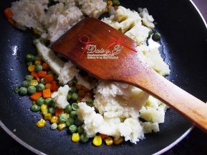 倒入橄榄油。爆炒红黄绿。好了关火。倒入土豆泥拌匀。我觉得大锅好搅拌一些。你也可以倒入土豆泥的盘子里。然后放入盐和黑胡椒。