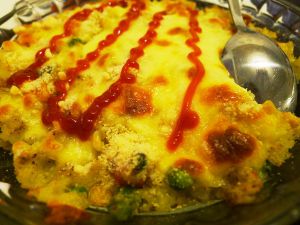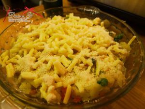 表面撒上芝士碎。我第一次做嘛。我不知道那个芝士粉拿来干嘛。结果也没有融化。所以你们做的时候不要要芝士粉哦。嘻嘻。