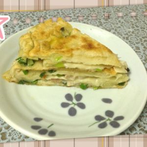 6.放上五花肉,并把薄饼从四周向中心折叠,和折纸差不多的感觉,折完后,再用擀面杖压平