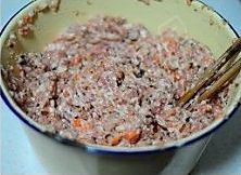 加入鸡蛋、香菇末、胡萝卜末,朝一个方向搅拌,搅拌均匀,这样馅就做好了