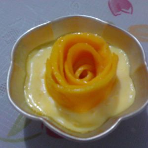 鲜芒果片纯手工砌成的黄玫瑰:先取两端最短小的芒果片圈成花心,然后依次取两端芒果片错落围边即可,慢慢就呈现出一朵艳丽的“黄玫瑰”哦