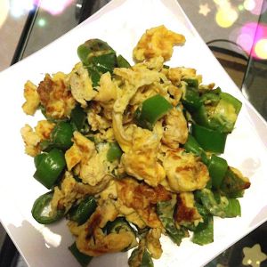 热锅倒入油 待油热后下葱花爆香 倒入青椒翻炒放盐鸡精炒匀