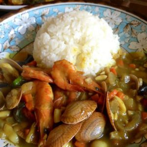 洋葱、胡萝卜、蘑菇、秋葵切丁,下锅过油。倒入海鲜翻炒,加一碗开水,加三块咖喱,拌匀。