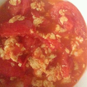 开始。热锅入油,油热入蛋液,稍稍炒过,挪至锅边,入西红柿翻炒。