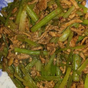 加肉丝、青椒、芹菜,大火翻炒。加盐起锅。