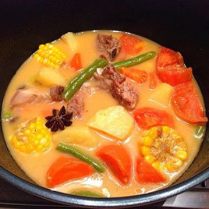加水,转砂锅烧开,放入一个挽成节的葱,开始愉快的炖煮时光,剩余配菜分阶段加入。整个炖煮时间1个小时,玉米与排骨和五花肉同炖,红萝卜30分钟放,土豆、四季豆40分钟放,西红柿最后10分钟放。放西红柿的时候就可以调盐和胡椒粉啦。