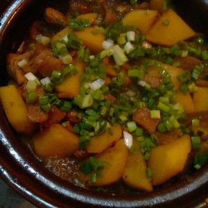 乘出放入砂锅内用大火煮开后转小火慢炖加入生抽 老抽一起中间翻2 3次以免粘锅底。等土豆可以又筷子一戳就烂的时候便可以撒上葱花开吃咯