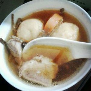排骨洗净放入炖锅,用开水烫的话肉质会发硬收缩反而会影响口感。加入胡椒 鸡粉 鱼露 墨鱼丸 茶树菇 胡萝卜洗净剁块放入炖锅。最后加入适量的水。如果先加水再放调味料的话会浮在水面,最惨的是胡椒粉会呛到自己,所以大家还是按步骤来上