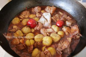 将栗子、玫瑰豆腐乳(南乳)、香料包、山楂、广东米酒一并放入锅中,加入热水至与锅内食材平齐,盖上锅盖大火煮开后,改中火烧35分钟左右至羊肉变软烂,开盖将汤汁收至稠即可关火装盘。