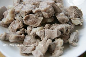 待焯出血沫后捞出羊肉,用热水冲去表面浮沫备用。