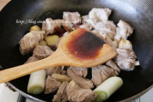 炒锅内油热后倒入姜片、葱段煸香后,倒入羊肉翻炒几下,加入老抽炒至上色。