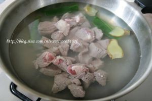 锅内放入清水,姜片、葱段,少许广东米酒,将羊肉放入焯水。