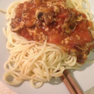 先倒油放大蒜炒肉末,肉末炒好了盛出来,国内的油不要倒掉,把蕃茄片放进去,等蕃茄都烧成糊糊状,放入蘑菇片,加点水,然后等蘑菇快好了就把肉末倒进去混一下,然后放盐,再加番茄酱,最后出锅时放点胡椒粉就OK啦