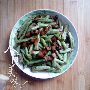 烧熟了的豆角加入肉丁,煸炒二三分钟后加点味精,再翻锅几下,上盘完成。