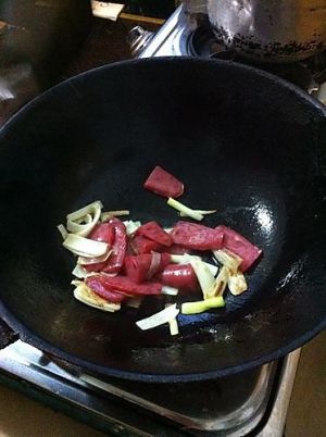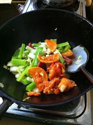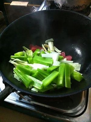 煸炒一会放入青笋等自己喜欢的菜,翻炒。